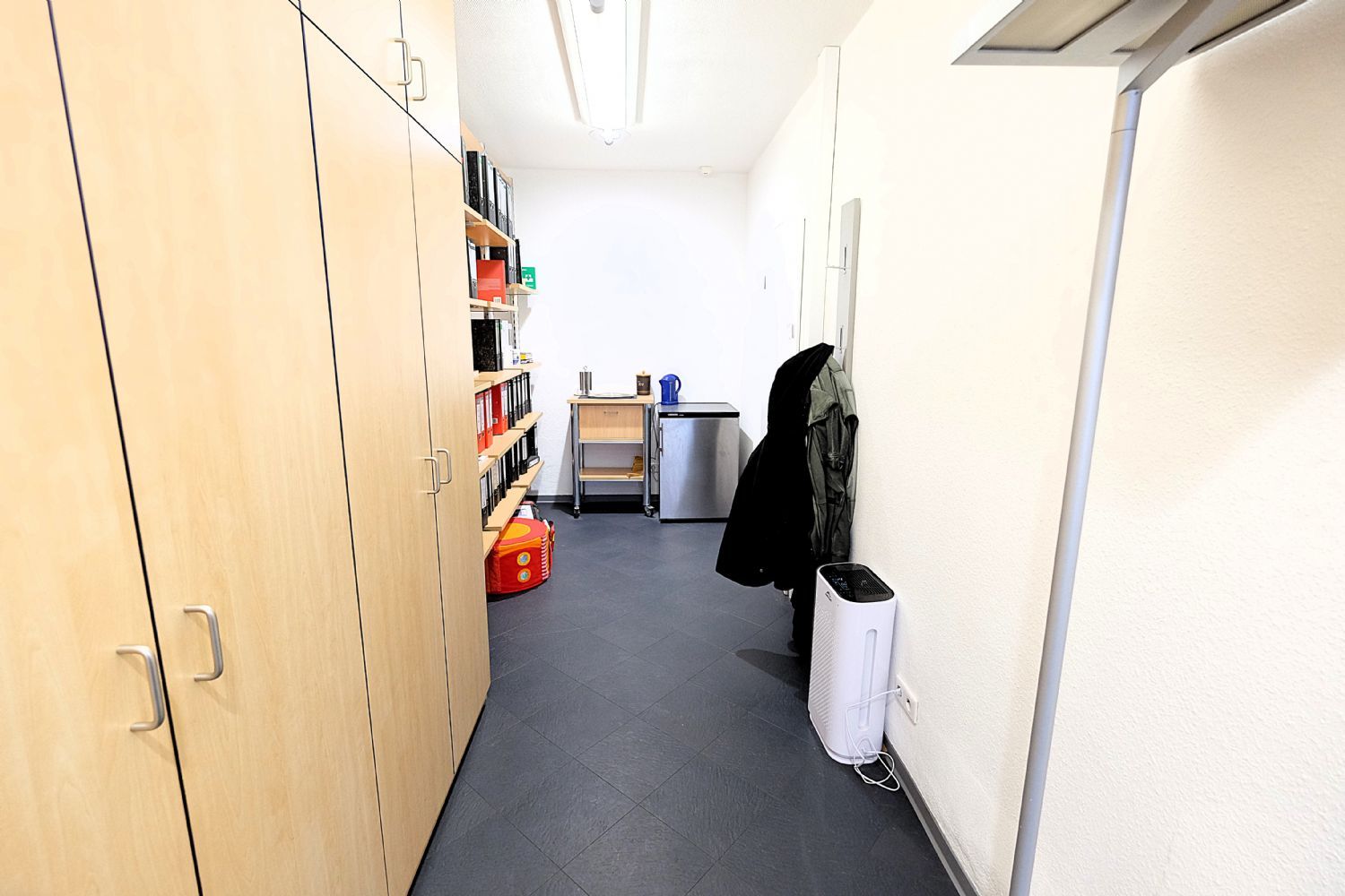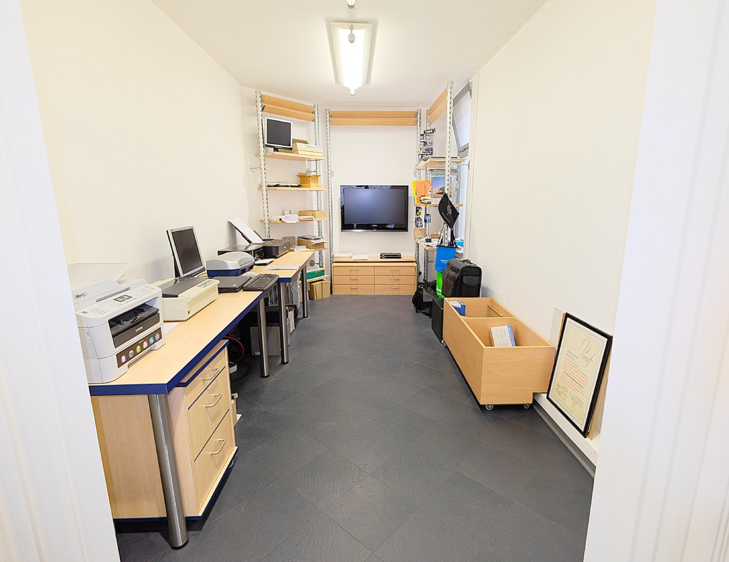 Erdgeschoss: Büroraum, Flur, Lager, WC, Fahrradraum, Zugang zum Hof und Heizungsraum